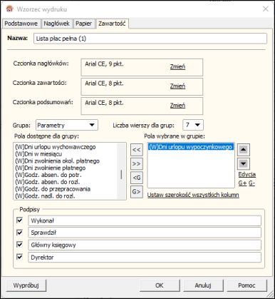 2. Ustawić własną nazwę dla wzorca, przejść na zakładkę Zawartość, a następnie jako grupę wybrać Parametry. Z tabeli Pola dostępne dla grupy wybrać odpowiednią pozycję (np. (W) Dni urlopu wypoczynkowego) i przenieść je do tabeli Pola wybrane w grupie (aby przenieść pozycję, należy kliknąć nią dwukrotnie, lub zaznaczyć ją i użyć przycisku >>). Na druku pozycje przenoszą się zgodnie z kolejnością w tabeli, można je przesunąć strzałkami po prawej stronie tabeli. Edycję wzorca należy zakończyć przyciskiem OK.