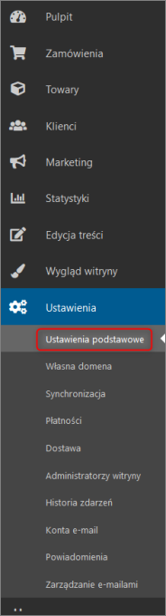 Zmiana wspomnianego powyżej faviconu odbywa się poprzez Panel Administracyjny vendero. Można się do niego dostać poprzez powiązanego Subiekta, ale też poprzez kilka innych sposobów, co zostało opisane w osobnym temacie e-Pomocy. Kolejnym krokiem jest przejście do Ustawienia - Ustawienia podstawowe.