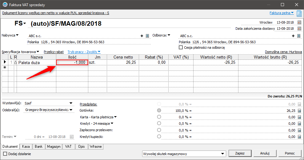 ​Opakowanie jest jedynym rodzajem kartoteki towarowej, który można wprowadzić na stan dokumentem sprzedaży. Aby przyjąć opakowanie na dokumencie sprzedaży, należy opakowanie wprowadzić z ilością ujemną, np. -1.