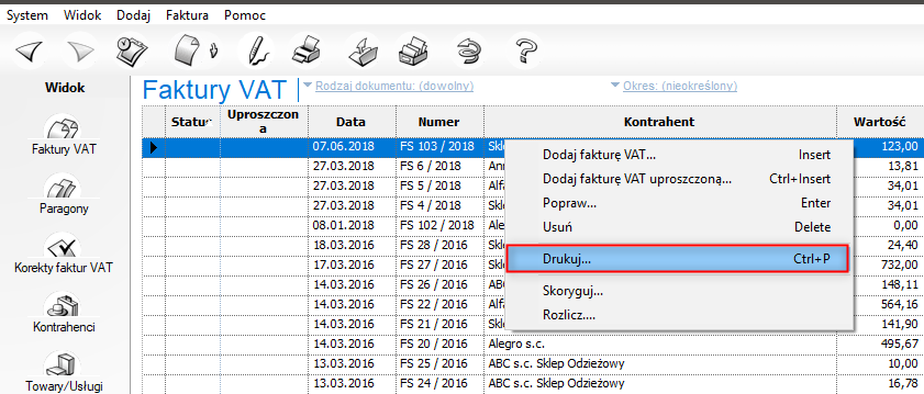 1. Na wystawionej wcześniej fakturze w PLN kliknąć Prawy Przycisk Myszy i wybrać opcję Drukuj.
