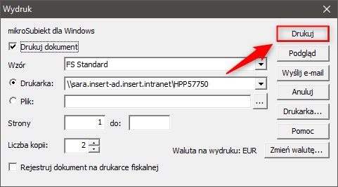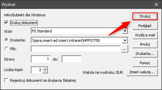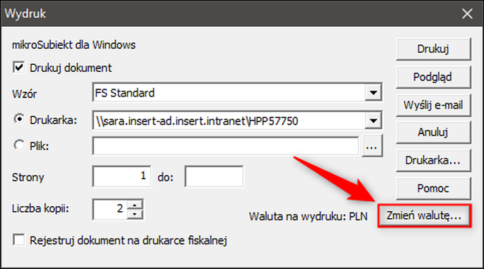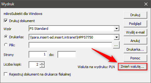 2. W oknie Wydruk kliknąć opcję Zmień walutę.