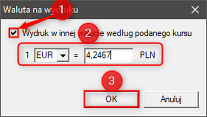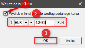 4. Po zmianie waluty dokument można wydrukować. Zostanie on przeliczony według podanego wcześniej kursu.