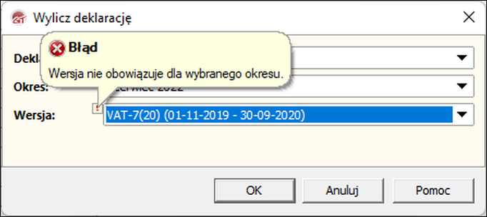 ​Komunikat może się pojawić, jeżeli użytkownik wybierze z listy deklaracji niewłaściwą jej wersję (należy zwrócić uwagę na zakres dat obowiązywania wersji deklaracji – informacja ta wyświetlana jest przy wyborze wersji, w oknie Wylicz deklarację – w polu Wersja w okrągłym nawiasie po numerze wersji). Jeśli na liście wersji deklaracji nie ma właściwego zakresu dat obowiązywania, świadczy to o nieaktualnej wersji programu. Należy zainstalować aktualną wersję i aktywować ją odpowiednim, dołączonym do instalowanej wersji, kodem aktywacyjnym lub przez internet.
