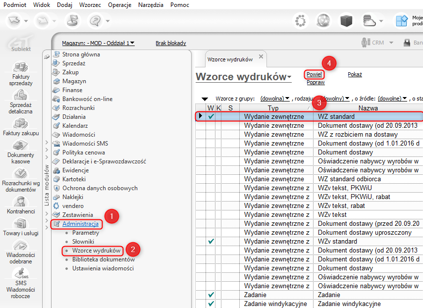 1. Przejść do modułu Administracja – Wzorce wydruków, zaznaczyć odpowiedni wzorzec i wybrać opcję Powiel (jeśli wzorzec nie był jeszcze nigdy edytowany). W przypadku własnego wcześniej skonfigurowanego wzorca wystarczy wybrać opcję Popraw.