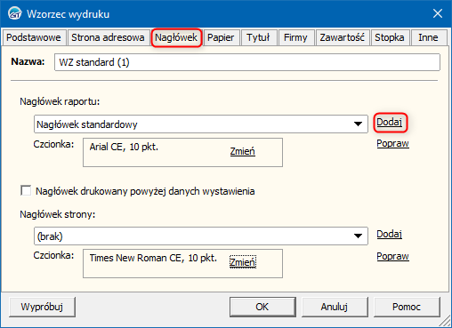 2. Następnie na zakładce Nagłówek, w sekcji Nagłówek raportu, kliknąć przycisk Dodaj.