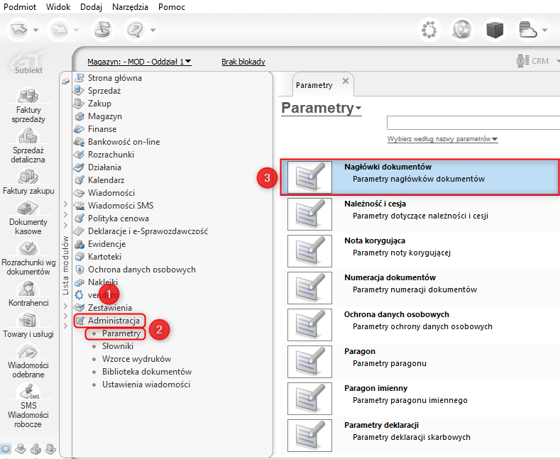 Nagłówek można również skonfigurować w osobnym module, tj. Administracja – Parametry – Nagłówki dokumentów.