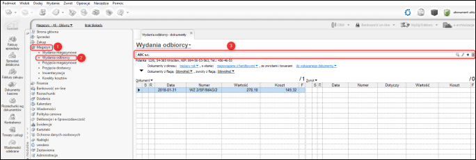 Moduł Wydania odbiorcy ewidencjonuje nowe typy dokumentów – zwroty do wydań zewnętrznych. Prezentowane są w nim wydania magazynowe i ich zwroty dla jednego kontrahenta wybranego przez użytkownika.