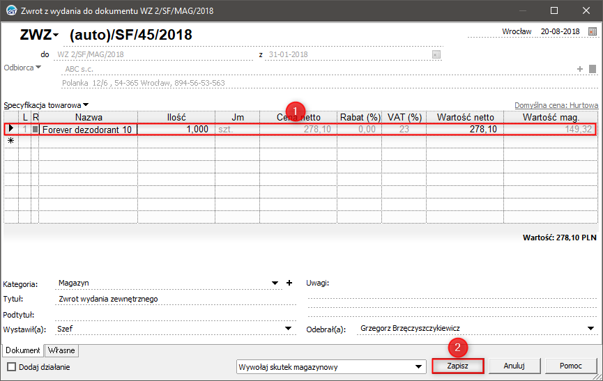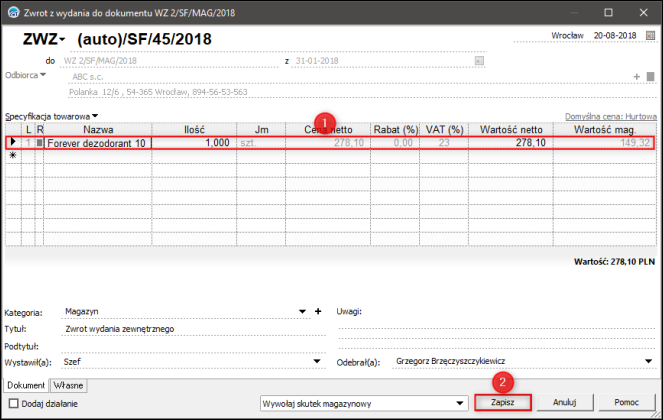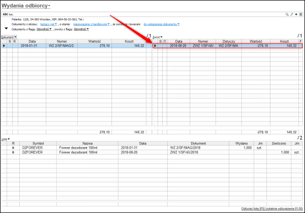 3. W oknie tworzenia dokumentu wybrać towary, które są zwracane.