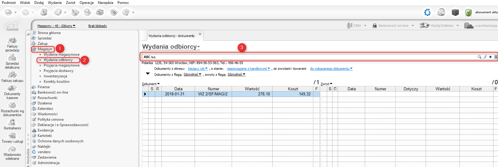 Moduł Wydania odbiorcy ewidencjonuje nowe typy dokumentów – zwroty do wydań zewnętrznych. Prezentowane są w nim wydania magazynowe i ich zwroty dla jednego kontrahenta wybranego przez użytkownika.