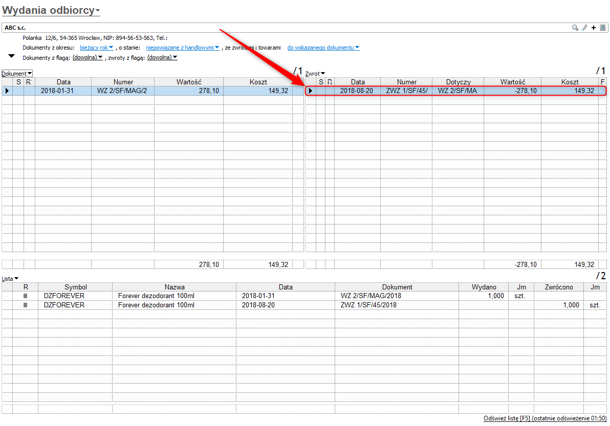 3. W oknie tworzenia dokumentu wybrać towary, które są zwracane.