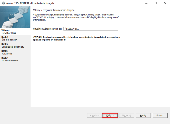 1. Po zainstalowaniu InsERT GT uruchomić program Przeniesienie danych. Można go odnaleźć po kliknięciu przycisku StartWszystkie programyInsERTInsERT GTNarzędziaPrzeniesienie danych. W oknie Przeniesienie danych, po wybraniu serwera, kliknąć przycisk Dalej.