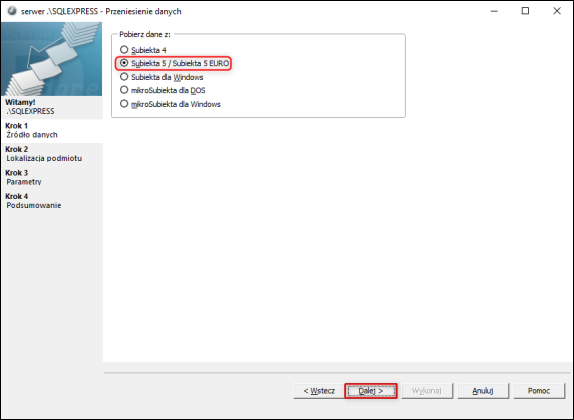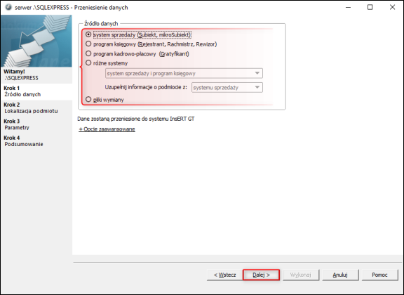 2. Zaznaczyć Źródło danych, przykładowo system sprzedaży (Subiekt, mikroSubiekt).