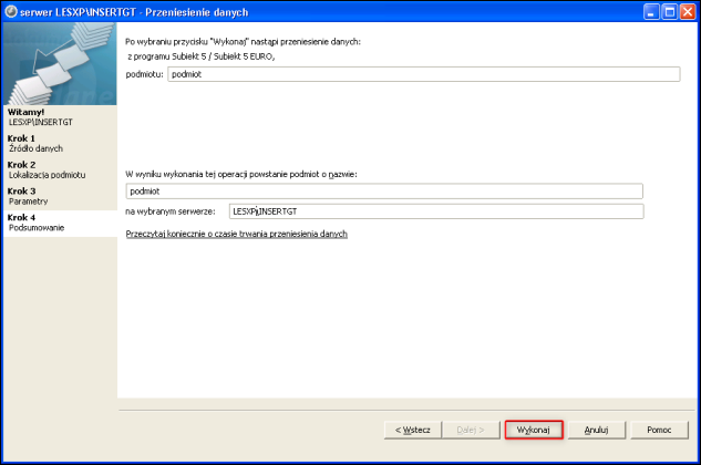 6. W następnym oknie można wpisać nazwę podmiotu, który powstanie w wyniku przeniesienia danych. Następnie kliknąć przycisk Wykonaj.