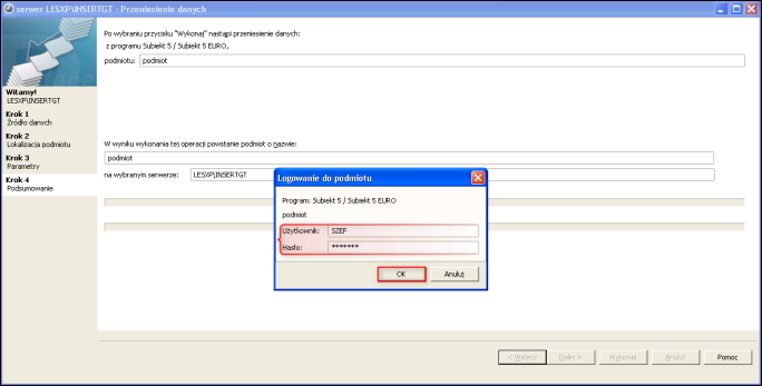 7. Program przed rozpoczęciem przeniesienia danych poprosi o zalogowanie się do podmiotu poprzez uwierzytelnienie się hasłem Szefa. Domyślnie hasło to subiekt.