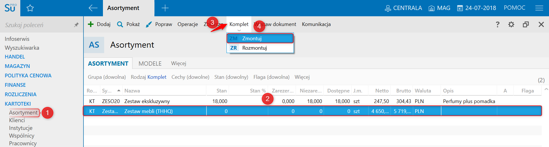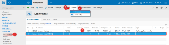 - poprzez przejście do modułu Asortyment, zaznaczenie kompletu, który zostanie zmontowany, rozwinięcie górnego menu Komplet i wybranie Zmontuj;