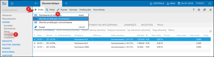 - poprzez przejście do modułu Zlecenia, rozwinięcie górnego menu Dodaj i wybór Zlecenie produkcyjne montowania.