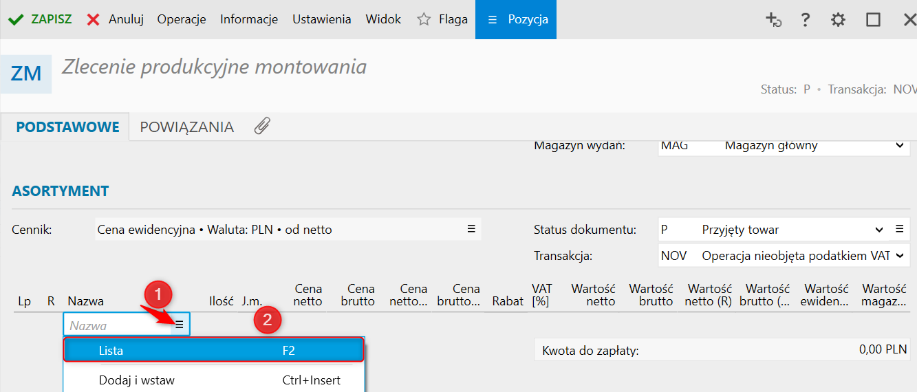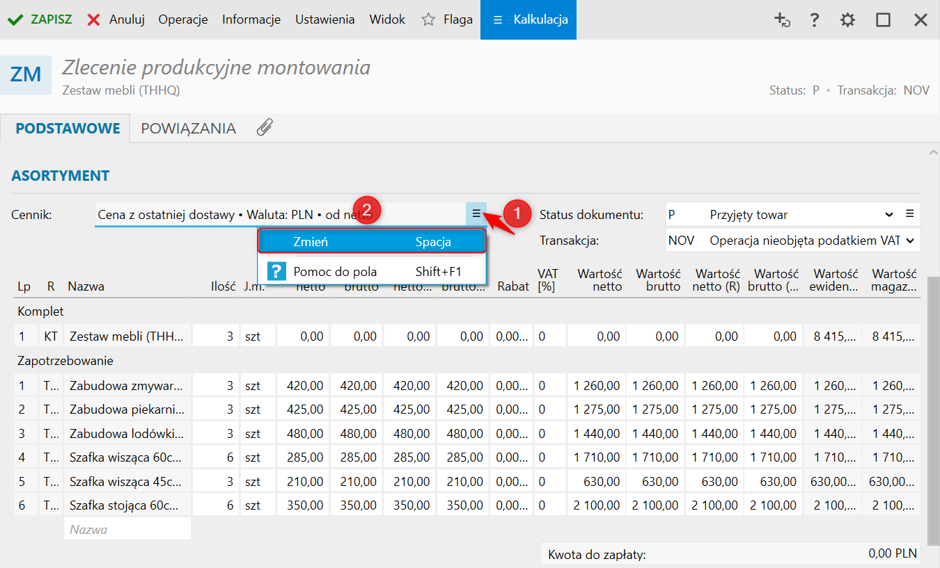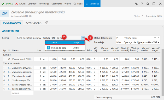 Uwaga! W przypadku błędnie wczytanych cen należy sprawdzić, jaki cennik jest brany pod uwagę na Zleceniu produkcyjnym montowania. Aby zmienić cennik, należy: