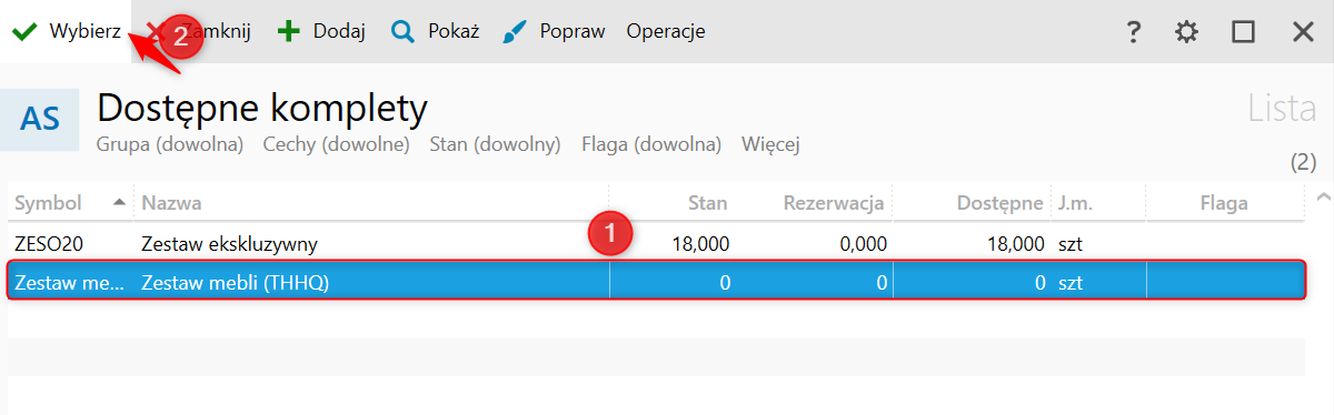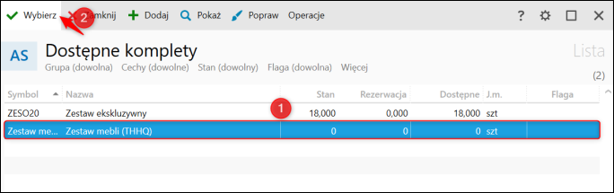 2. Zaznaczyć Komplet, który zostanie zmontowany i kliknąć górne menu Wybierz.