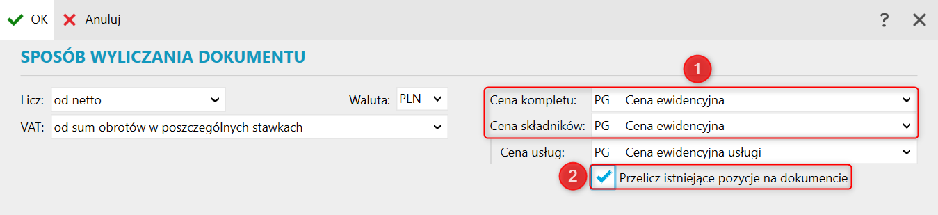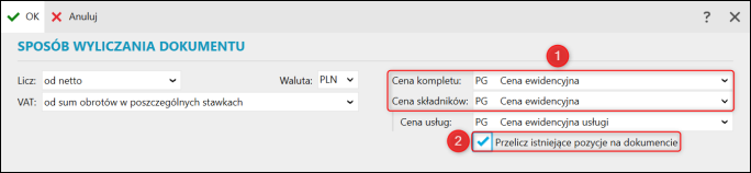 2. Określić ceny kompletu i składników, zaznaczyć opcję Przelicz istniejące pozycje na dokumencie i zatwierdzić przyciskiem OK.