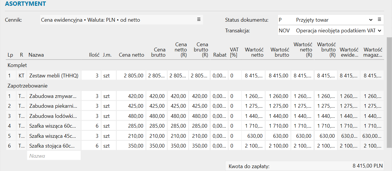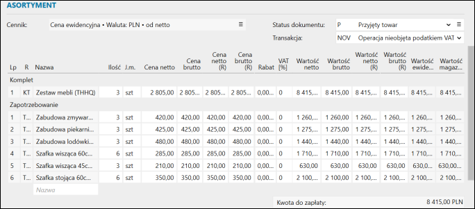 Po wczytaniu kompletu w sekcji Asortyment tabela podzieli się na dwie części: