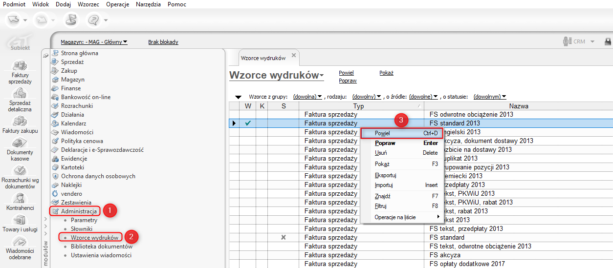 1. Z listy modułów wybrać AdministracjaWzorce wydruków, na liście znaleźć wzorzec, który będzie edytowany (np. FS standard 2013) i kliknąć Prawy Przycisk MyszyPowiel.