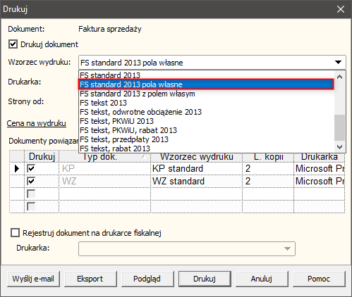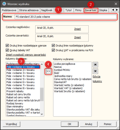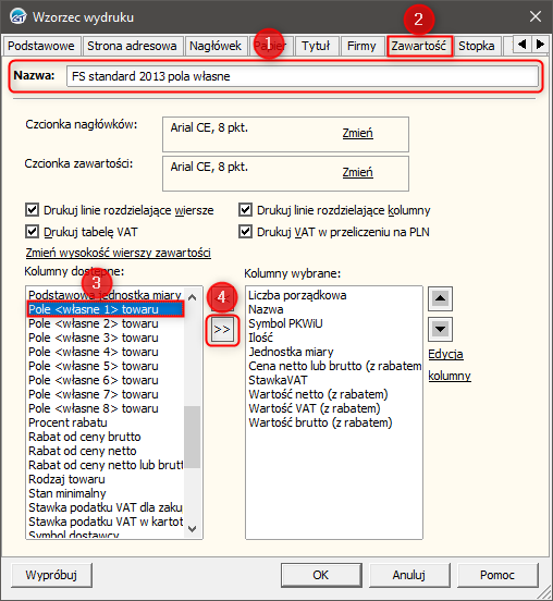 Pola własne towarów mogą zostać użyte na wydruku dokumentu (np. faktury sprzedaży). Aby umieścić pole własne towaru na wydruk, należy: