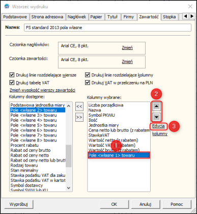 3. Kiedy Kolumna znajduje się w sekcji Kolumny wybrane, można ustalić jej położenie względem innych kolumn. W tym celu należy zaznaczyć kolumnę i posłużyć się strzałkami skierowanymi w górę i w dół. Po ustaleniu kolejności drukowanych kolumn przy zaznaczonym polu własnym kliknąć Edycja.
