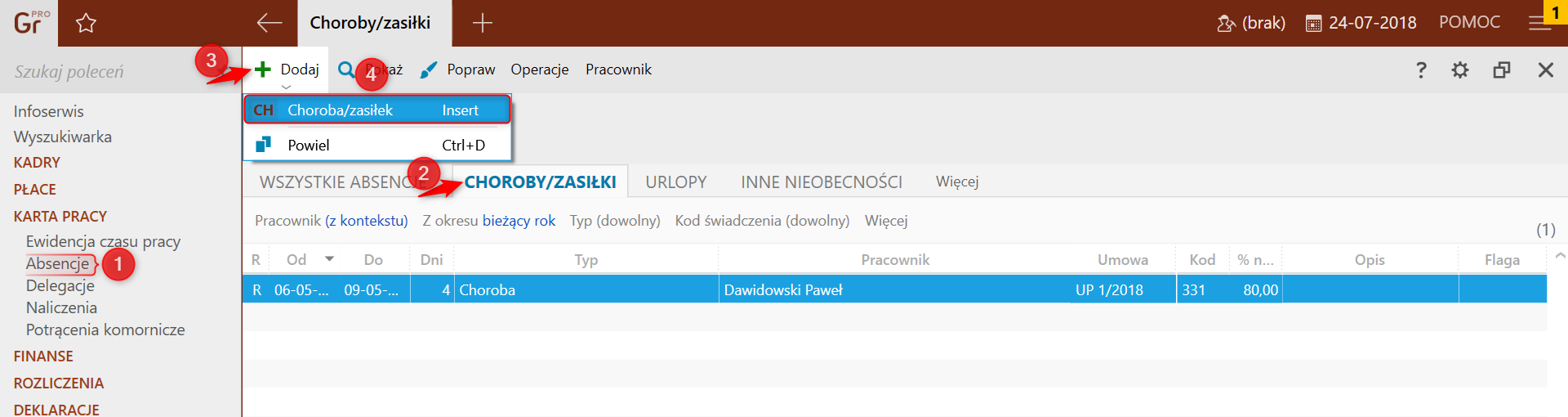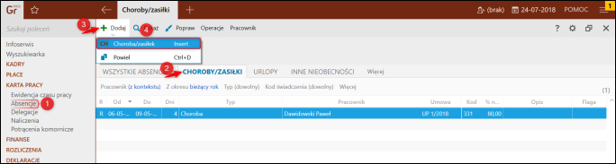 1. Przejść do modułu Absencji, na zakładce Choroby/zasiłki rozwinąć górne menu Dodaj i wybrać Choroba/zasiłek.