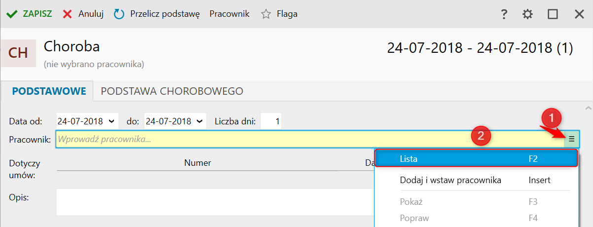 2. Rozwinąć menu przy polu Pracownik i wybrać Lista.