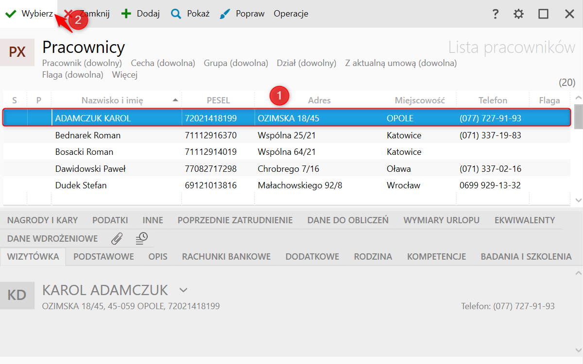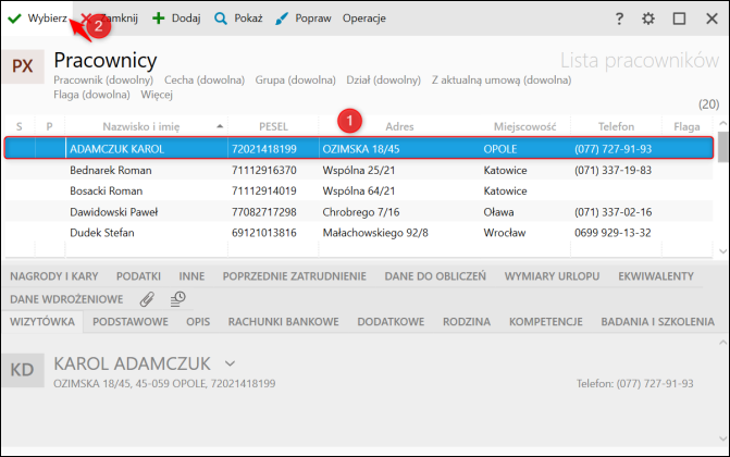 3. Zaznaczyć odpowiedniego Pracownika i kliknąć górne menu Wybierz.