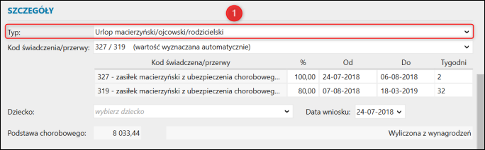 4. W sekcji Szczegóły rozwinąć opcję Typ i wybrać Urlop macierzyński/ojcowski/rodzicielski. Uzupełnić pozostałe dane i zapisać utworzoną Absencje.