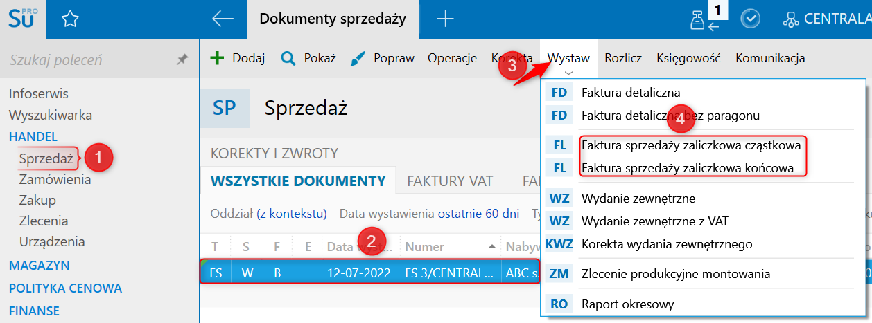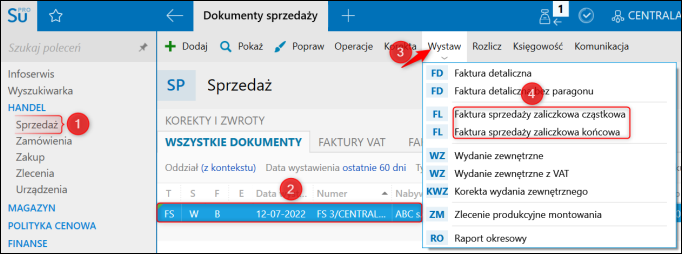 Następnie wybrać z górnego menu Wystaw ​ Faktura sprzedaży zaliczkowa cząstkowa bądź Faktura zaliczkowa końcowa.