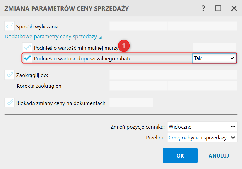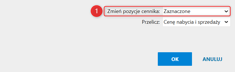 Należy pamiętać, żeby w otwartej oknie Zmiana parametrów ceny nabycia pozostawić Zmień pozycje cennika: Zaznaczone. Spowoduje to zmianę określonych parametrów tylko dla zaznaczonych wcześniej pozycji.