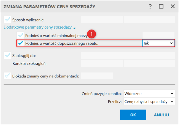 - Podwyższenie ceny sprzedaży o dopuszczalny rabat – Dopuszczalny rabat określa maksymalną wysokość rabatu podczas sprzedaży, gdy jest stosowana dana pozycja z cennika. Pole Uwzględnij dopuszczalny rabat określa, czy do sugerowanej ceny sprzedaży ma zostać doliczony dopuszczalny rabat zdefiniowany przy pozycji. Uwzględnienie dopuszczalnego rabatu w cenie sprzedaży pozwala użytkownikowi podczas sprzedaży zachować odpowiednią zyskowność nawet po wprowadzeniu maksymalnego rabatu.