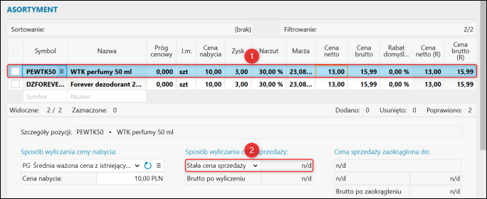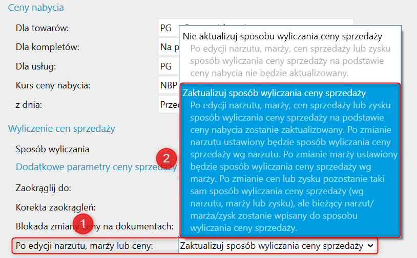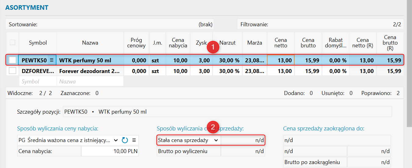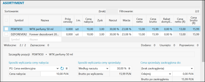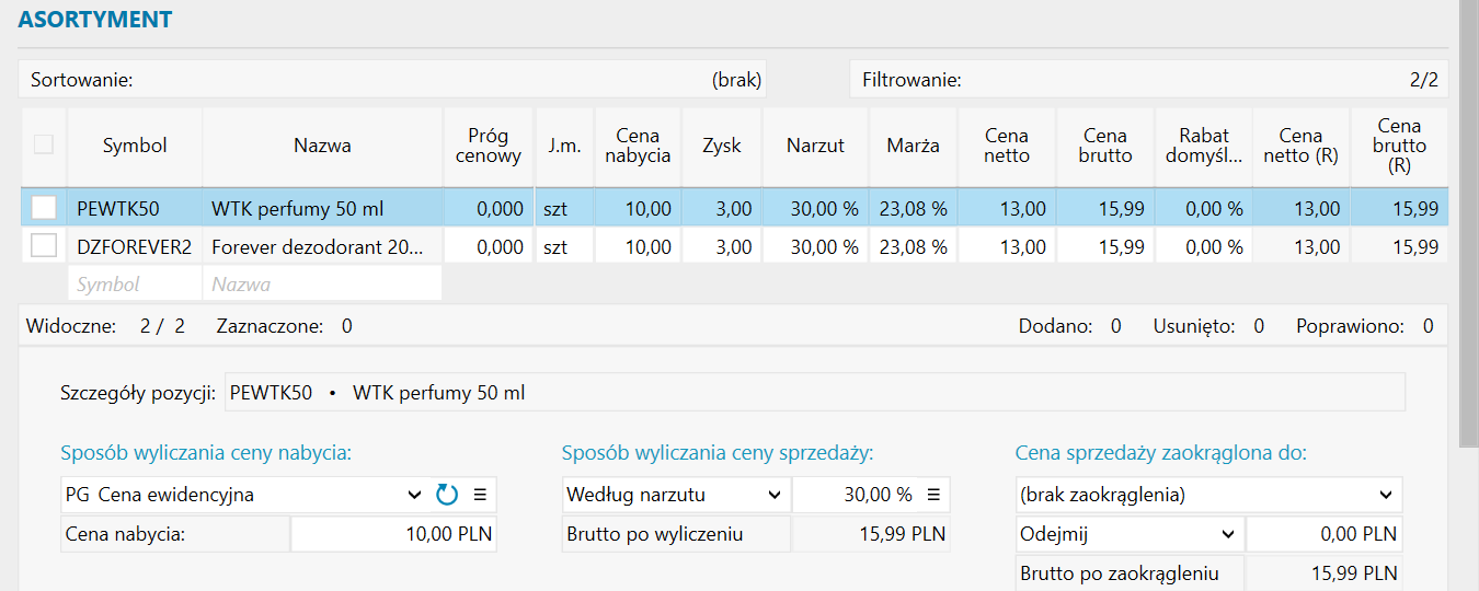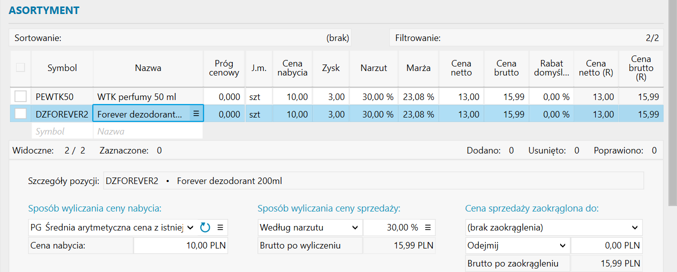 Na tę chwilę oba towary mają cenę nabycia wynoszącą 10 zł. Po zaznaczeniu którejkolwiek pozycji przedstawi ona wcześniejsze założenia. Aktualizacja cen następuje wg parametrów widocznych w tym miejscu.