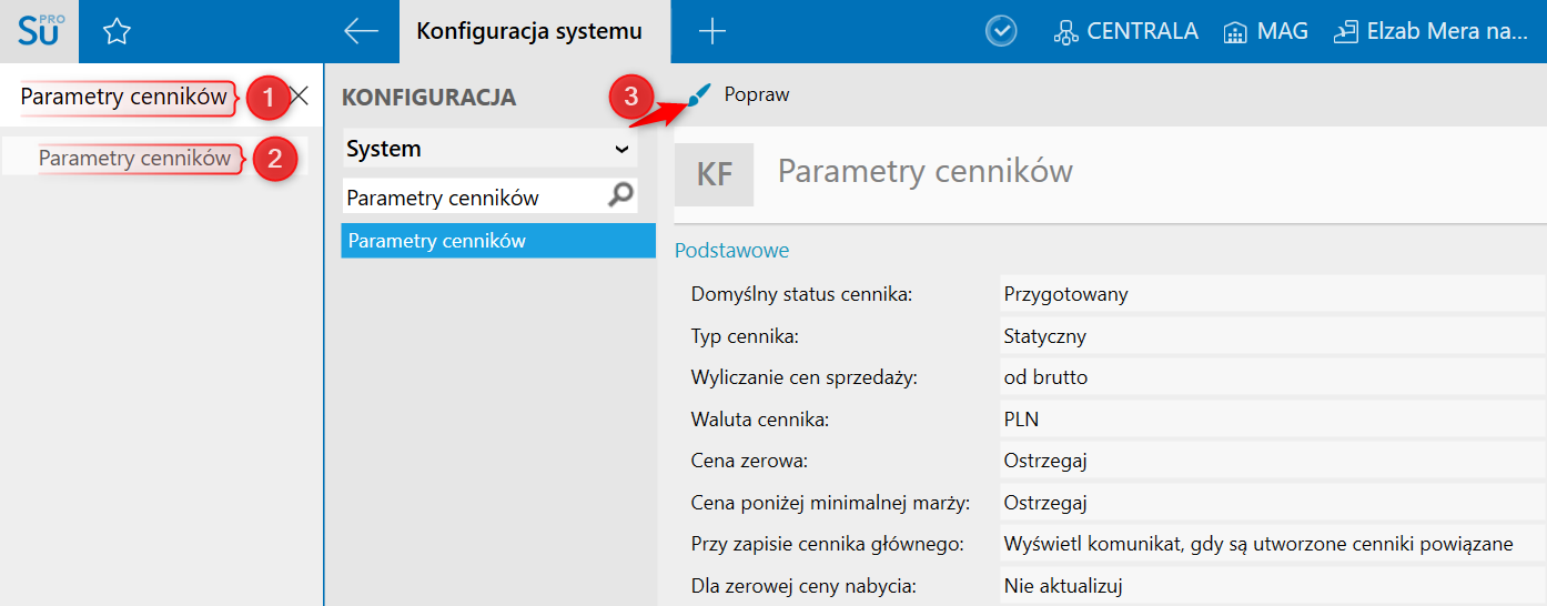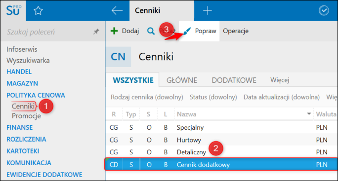 Parametryzacja tych cen ma miejsce w Cennikach głównych i dodatkowych. Aby otworzyć tę konfigurację, należy przejść do modułu Cenniki, wybrać cennik, któremu sprawdzone i w dalszych krokach konfigurowane zostaną parametry i kliknąć górne menu Popraw. W przypadku potrzeby stworzenia nowego Cennika warto o tym przeczytać w innym temacie e-Pomocy technicznej TUTAJ.