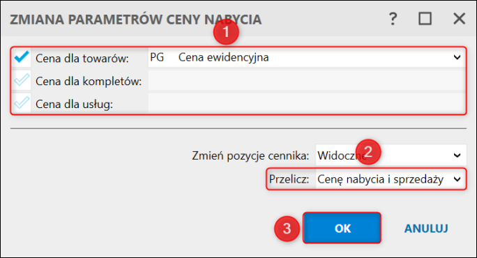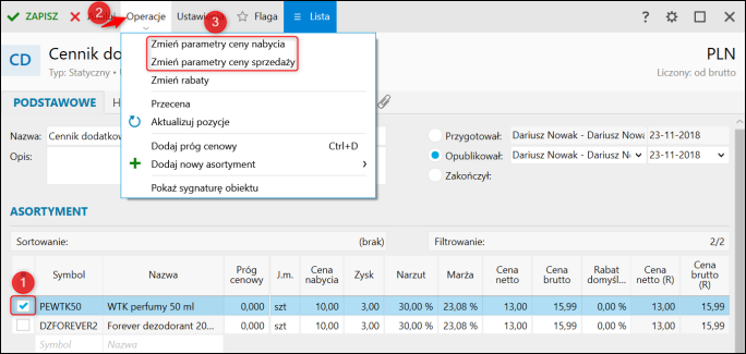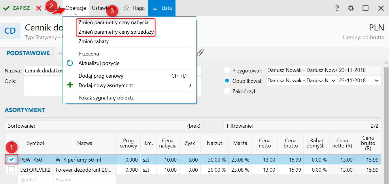 Dalsze kroki wyglądają podobnie, jak w przypadku zaznaczania poszczególnych pozycji, czyli należy rozwinąć górne menu Operacje i wybrać Zmień parametry ceny nabycia/sprzedaży.