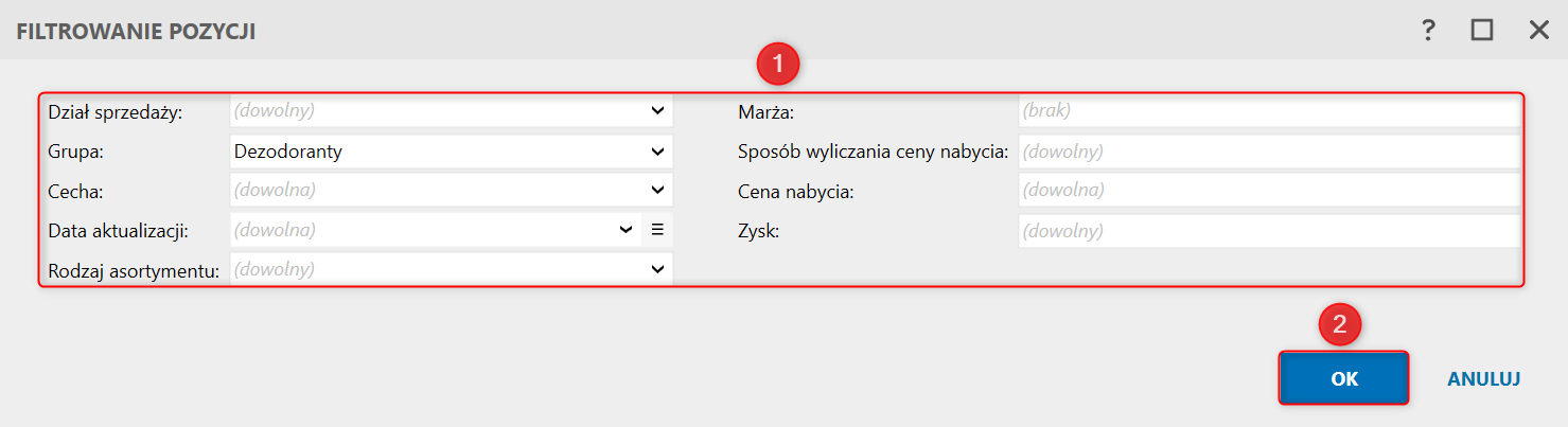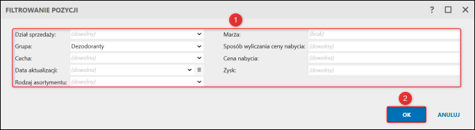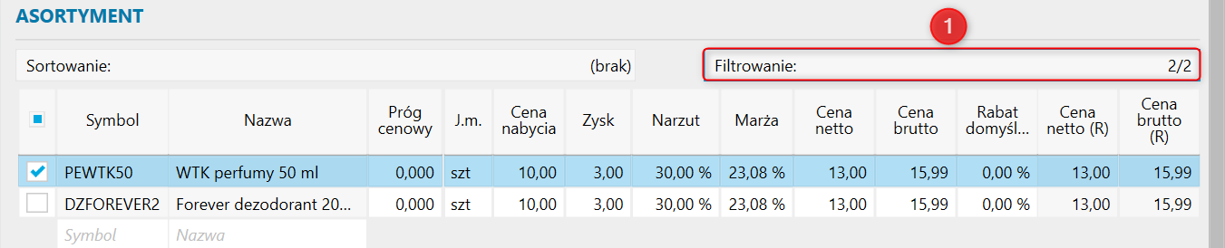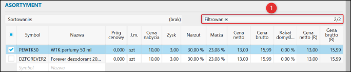 Można również skorzystać z opcji Filtrowania, gdzie po kliknięciu Filtrowanie tuż nad tabelą z asortymentem wystarczy wybrać odpowiednie filtry i zatwierdzić przyciskiem Zapisz.