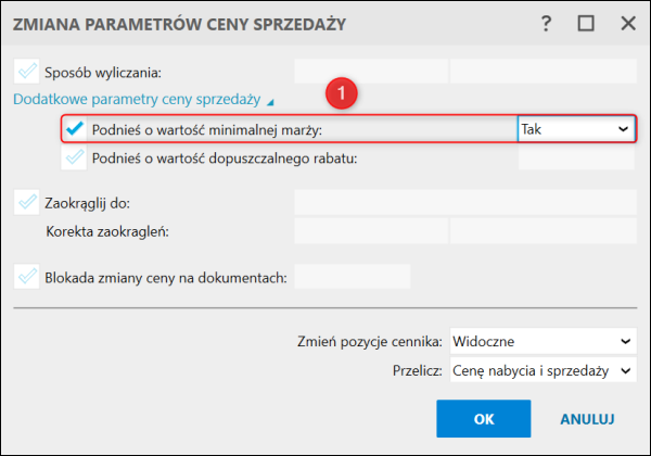 Podwyższenie ceny sprzedaży o minimalną marżę – w programie Subiekt nexo istnieje możliwość ustawienia Minimalnej marży, która umożliwia kontrolę ustalania cen sprzedaży asortymentu. Opcja dostępna w oknie Zmiana parametrów ceny sprzedaży określa, czy do sugerowanej Ceny sprzedaży ma zostać doliczona Minimalna marża zdefiniowana dla towaru lub usługi. Jeśli użytkownik wybierze opcję tak, to cena zostanie odpowiednio powiększona o Minimalną marżę.