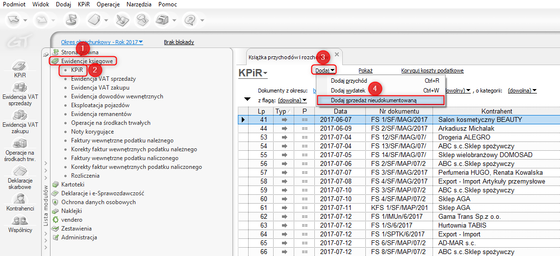 Sprzedaż nieudokumentowana występuje w sytuacji kiedy sprzedający produktu, towaru bądź usługi nie wystawia przy tej transakcji dokumentu np. faktury. Taką sprzedaż należy jednak ewidencjonować w Podatkowej Księdze Przychodów i Rozchodów. Aby dodać sprzedaż nieopodatkowaną do Rachmistrza GT, należy:
