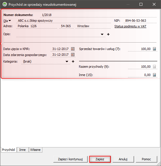 2. W oknie Przychód ze sprzedaży nieudokumentowanej wprowadzić Nr dokumentu, Kontrahenta, Datę ujęcia w KPiR i Datę zdarzenia Gospodarczego oraz opcjonalnie kategorię. Następnie wpisać kwotę transakcji w odpowiedniej kolumnie KPiRu. Sprzedaż nieudokumentowaną wprowadzić do programu przyciskiem Zapisz.