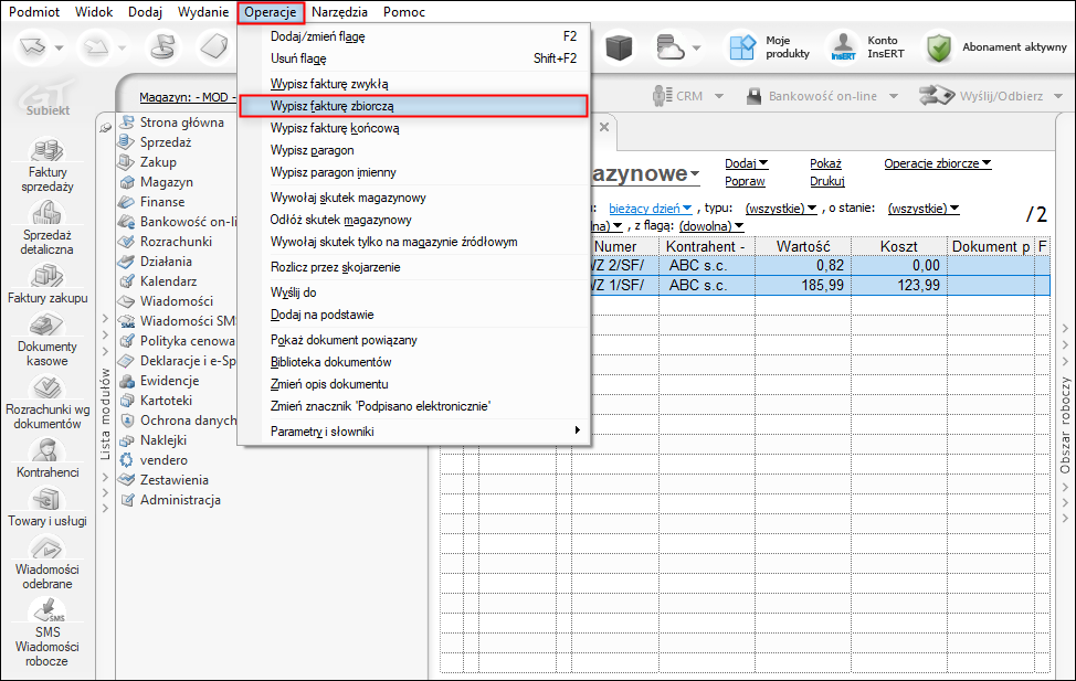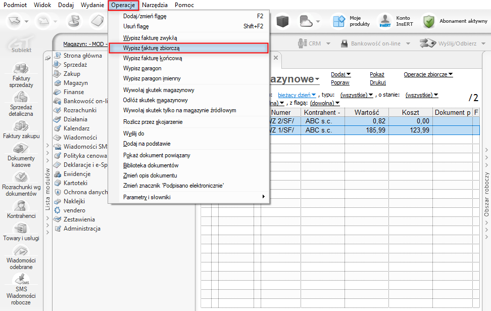 2. W głównym menu programu wybrać opcję Operacje – Wypisz fakturę zbiorczą.