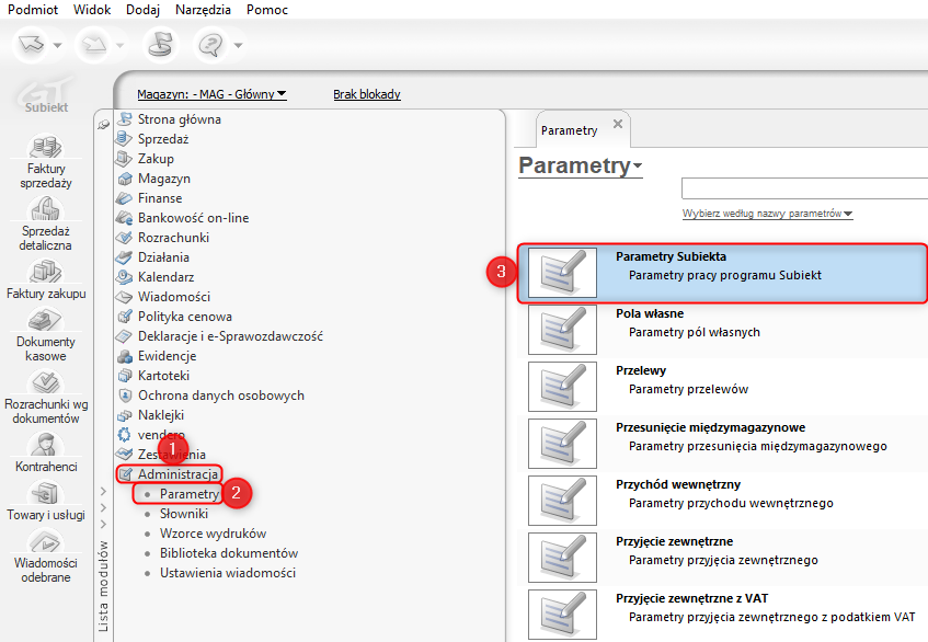 1. Z listy modułów wybrać Administracja – Parametry, a z listy parametrów Parametry Subiekta.