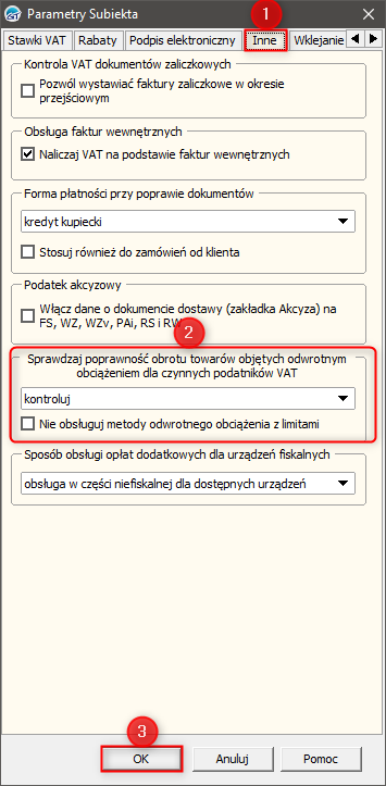 2. Na zakładce Inne ustawić opcję Sprawdzaj poprawność obrotu towarów objętych odwrotnym obciążeniem dla czynnych podatków VAT na kontroluj. Zmiany zapisać przyciskiem OK.