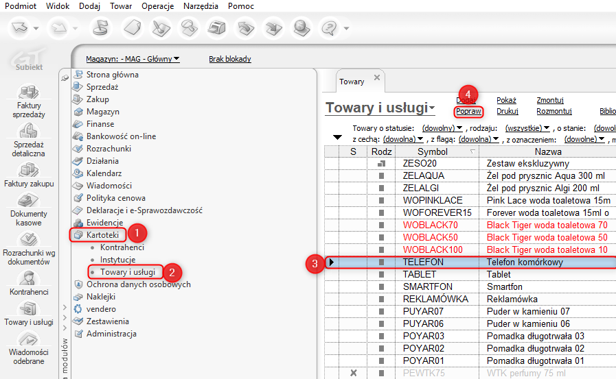 3. W następnym kroku należy z listy modułów wybrać Kartoteki – Towary i usługi, zaznaczyć towar podlegający odwrotnemu obciążeniu i kliknąć opcję Popraw.
