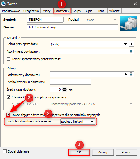 4. Na zakładce Parametry zaznaczyć Towar objęty odwrotnym obciążeniem dla podatników czynnych, a Limit dla odwrotnego obciążenia ustawić na podlega limitowi. Zmiany zapisać przyciskiem OK.