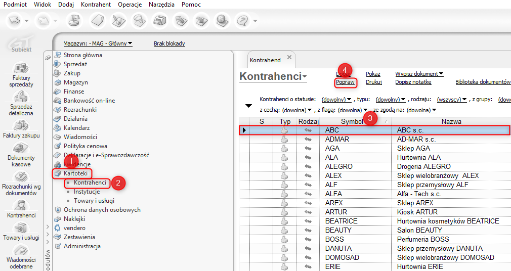 5. W celu generowania ostrzeżeń o przekroczeniu limitu niezbędne jest zaznaczenie w kartotece kontrahenta parametru Czynny podatnik VAT oraz ustawieniu przy nim jednolitej transakcji w tym celu należy z listy modułów wybrać Kartoteki – Kontrahenci zaznaczyć kontrahenta i kliknąć Popraw.