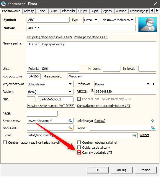 6. W kartotece kontrahenta zaznaczyć Czynny podatnik VAT (po wcześniejszym sprawdzeniu statusu podmiotu w VAT).