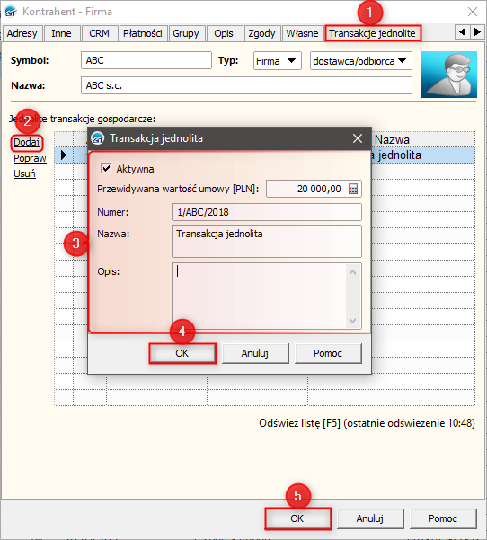 7. Przejść na zakładkę Transakcje jednolite, kliknąć opcję Dodaj i w następnym oknie wypełnić: