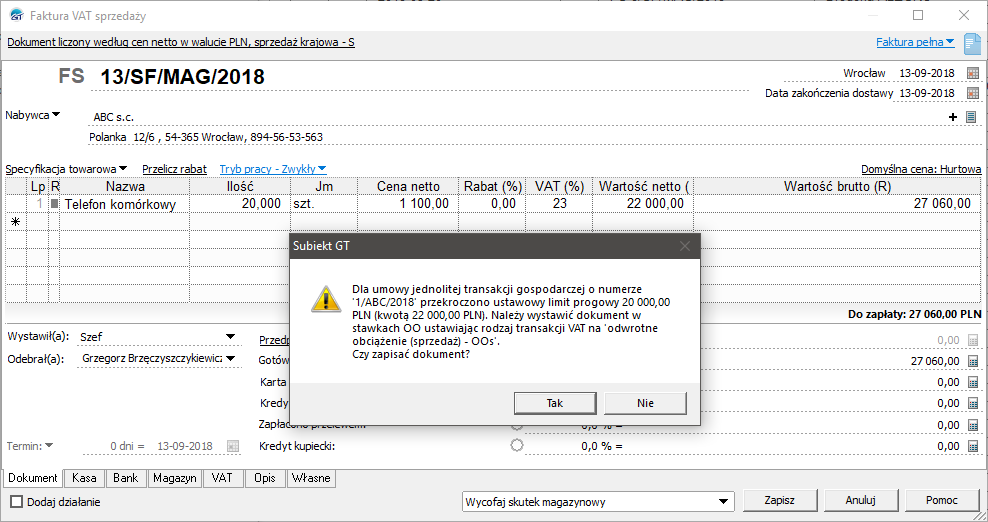 W momencie wystawiania faktury na towar objęty odwrotnym obciążeniem dla kontrahenta, który jest czynnym podatnikiem VAT i ma wprowadzoną transakcję jednolitą, w sytuacji przekroczenia limitu program ostrzeże użytkownika stosownym komunikatem.